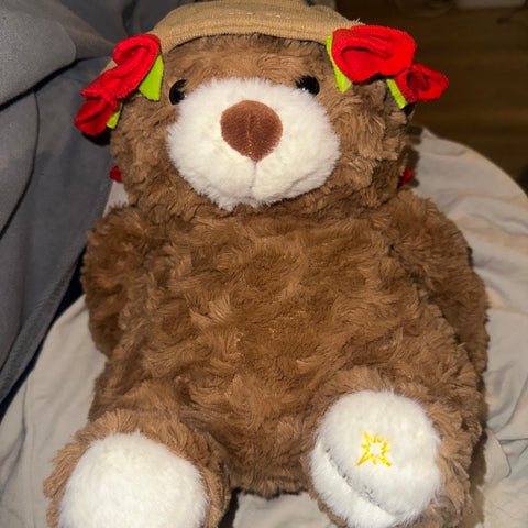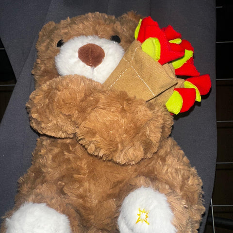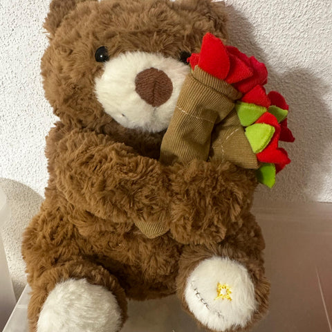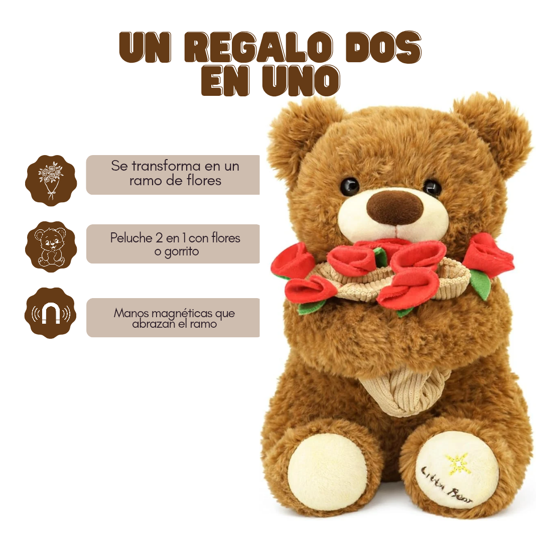 El osito incluye un gorrito especial que se transforma fácilmente en un pequeño ramo de flores, creando una sorpresa única en un solo regalo.
